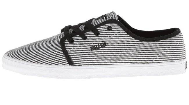 The Fallen Daze Shoes in black stripes-white are a thin, low profile skate shoe, perfect for skating and relaxing. Made with comfort and breathability in mind, they feature a canvas upper, vulcanized outsole, seamless toecap, reinforced stitching at ollie area, thin tongue and collar and Fallen detailing throughout.