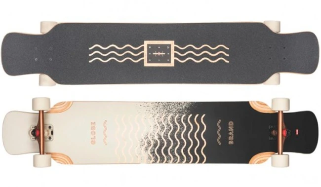 The Globe Geminon XL Spray Wave Black Copper 47″ Dancing Longboard Complete is a super fun double kick, symmetrical dancer to cut rug all over the streets. This 47″ ride offer heaps of room for fancy foot work and rad dancing tricks. The long wheel base gives the Geminon XL a stable and easy feeling to get you around the city in a breeze without spilling your coffee. 8-ply Maple construction allows a sweet amount of flex to bounce you from carve to carve, with the double kicks and symmetrical design setting you free to lay down big no-complys, boardslides and cross step all the way home. The Copper Magnesium Slant trucks shave weight from the set up and the Globe Conical wheels are very fast and smooth, for an easy roll over rougher terrain.
