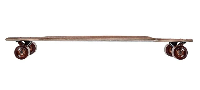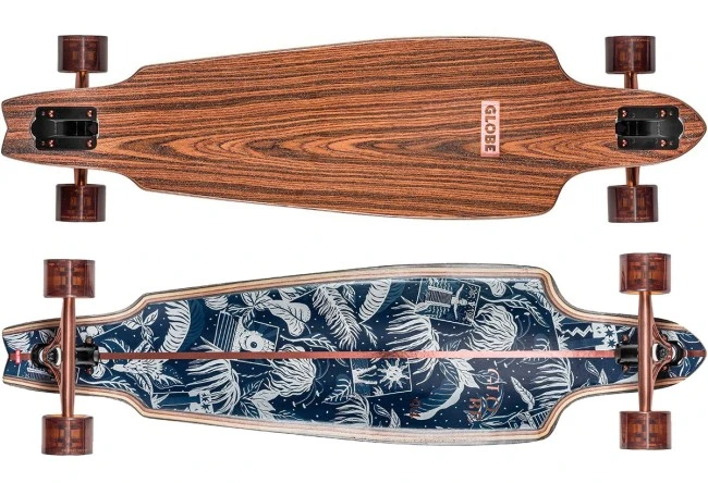 De Globe Prowler is een van de eerste boards uit de Globe longboardcollectie. Vanwege de drop-through flushcut truck montage, biedt de Prowler een laag zwaartepunt, wat de veiligheid en stabiliteit verhoogt en het vergemakkelijkt het pushen, omdat je minder ve door je knieën hoeft te buigen. Deze Prowler is geweldig mooi afgewerkt, met koperstrip en messing schroevenset.