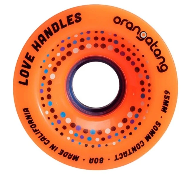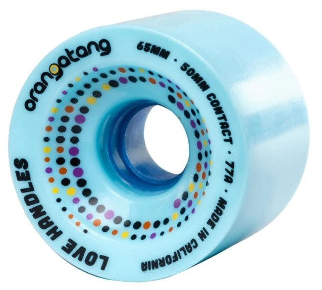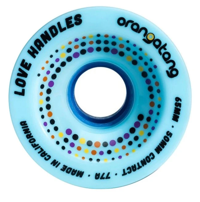 Spread some love with Orangatang Love Handles Longboard Wheels! These colorful beauties come in two options orange: with a Diameter of 65mm and a hardness of 80A and blue: with a Diameter of 65mm and a hardness of 77A. They are quick, light and grippy which makes a very pumpable wheel!