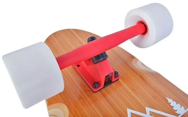 Het Tempish Flow 42″ pintail longboard is een middellange cruiser voor een stabiele en toch wendbare rit. Pintails zijn meestal tussen de 36″ en 46″ lang. Hoe langer hoe stabieler. Stabieler betekent ook minder wendbaar. Met dit fraai afgewerkt board met zijn 70 mm hoge wielen kan je prima flinke afstanden afleggen, maar het is ook geschikt voor kortere ritten over de boulevard of door drukke winkelstraten in de stad te cruisen. Het board heeft een lichte concaaf wat de stijfheid verhoogd, je staat meer “gelocked” en kan sneller bochten insturen. De Flow 42″ komt uit de bamboe collectie is gemaakt van 2 lagen bamboe en 5 lagen Russische esdoornhout.